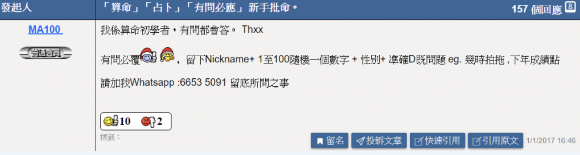 2017年我在連登討論區上,開了第一個為人免費算命占卜的帖子,而第一個帖子已收到熱烈的回響,很多網友都對我的占卜算命技藝讚好!帖子意想不到地反應熱烈,第一個帖子已收到157個回應,很多人亦回饋說準,從而,其後亦有了第二、第三個為人免費算命占卜的帖子。