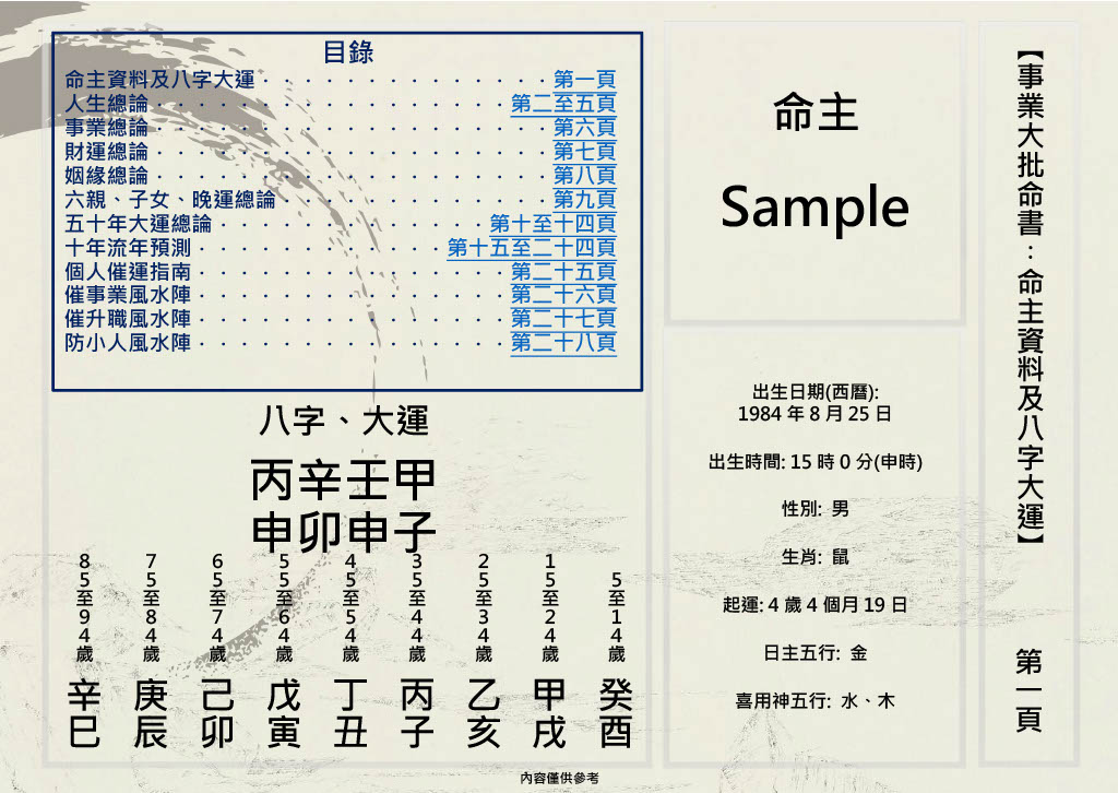 在你收取命書後, 大部份都會是你八字命格裡面的一些運勢分析, 以及評論你在各個時期需要提防及注意之事。另外最後一頁是一個屬於你個人專屬的催運教學,是按你八字命格獨家定制的。
