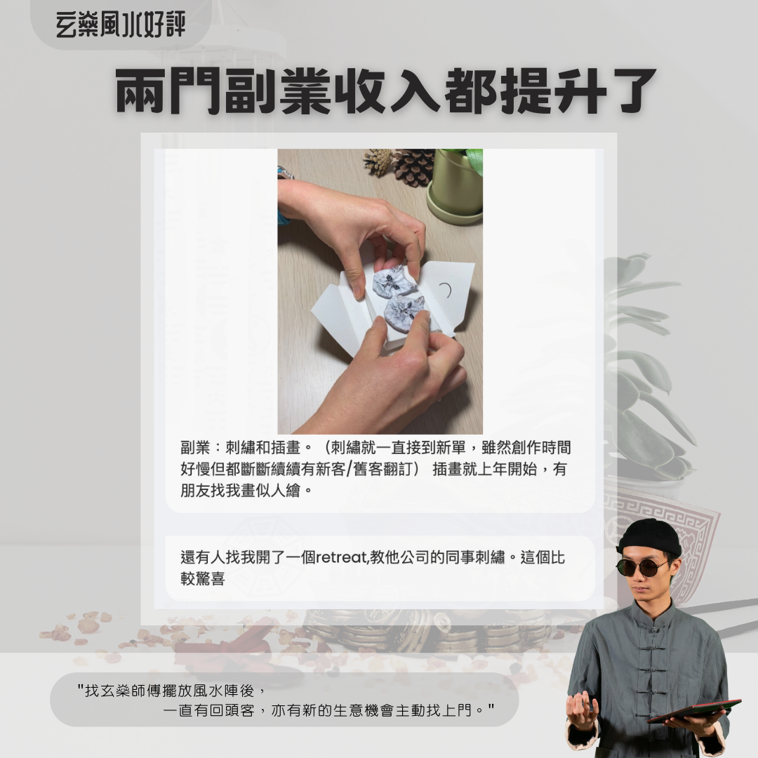 "以前家宅較多是非、家庭不和. 而且一直財運很差, 做生意做了三年多也是回本期! 這個風水陣幫了我很多, 現在月營業額已有10多萬."