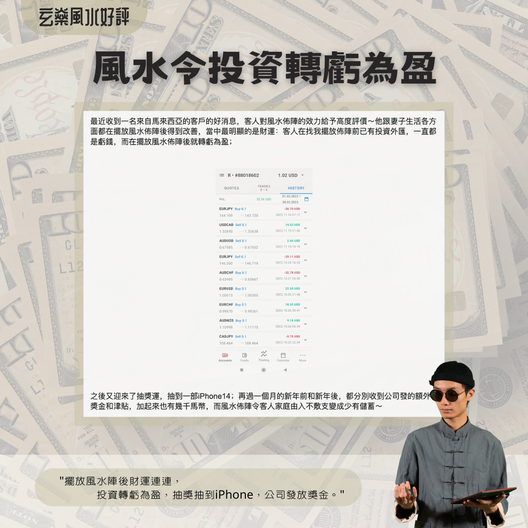 “自己一直覺得單位風水好差,厄運連連,除了去年投資失誤外. 家人有病花費亦很大. 現在經師傅調理風水後, 財運漸漸好轉. 投資我喜歡買期權, 近來斬獲也有6位數."